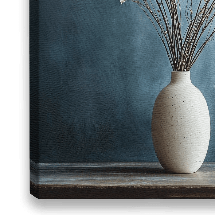Dieses ruhige Blumenstillleben verkörpert die Essenz raffinierter Einfachheit und natürlicher Anmut. Im Mittelpunkt steht eine elegante, weiße Keramikvase, gefüllt mit zarten Zweigen weißer Blüten, die sich vor einem sanft verlaufenden blauen Hintergrund ausdehnen. Der Kontrast zwischen der robusten Vase und den zerbrechlichen Blumen…