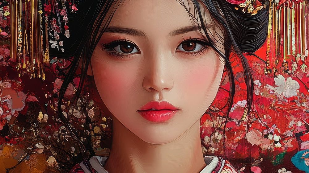 Das Bild zeigt eine junge Frau mit langen schwarzen Haaren, die einen traditionellen japanischen Kimono trägt. Der Kimono hat eine leuchtend rote Farbe mit komplizierten Blumenmustern und goldenen Akzenten. Ihr Haar ist mit roten Blumen geschmückt, und ihr Make-up ist kräftig und auffallend, mit roten Lippen und braunem Lidschatten. Der Hintergrund ist eine Unschärfe aus Rot, Weiß und Gold, die ein Gefühl von Bewegung und Energie vermittelt.