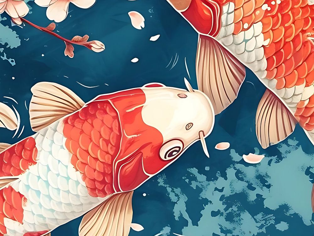 Dieses Gemälde hat einen charmanten, skizzenhaften Stil, in dem japanische Koi-Karpfen und eine Kirschblüte in einer harmonischen Szene zusammenkommen. Die Umrisse der Koi-Karpfen sind anmutig gezeichnet, und ihre Farben - leuchtendes Orange, Weiß und tiefes Schwarz - schimmern auf der Leinwand. Sie scheinen in einem imaginären Teich zu schwimmen, und ihre eleganten Bewegungen spiegeln die Dynamik des Wassers wider.