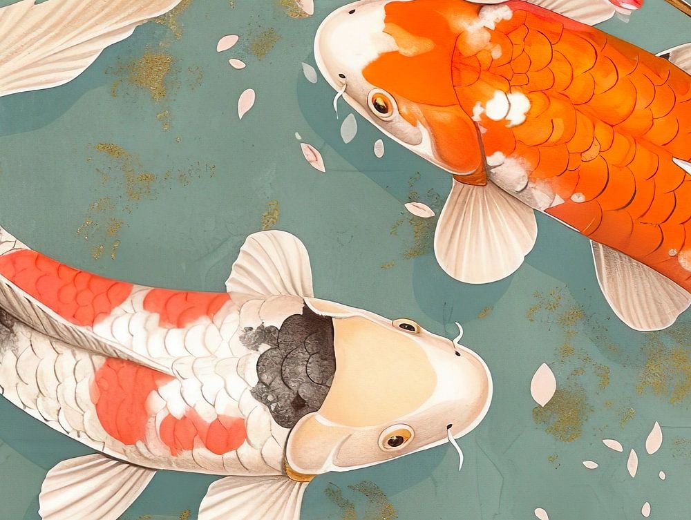 Dieses Gemälde hat einen charmanten, skizzenhaften Stil, in dem japanische Koi-Karpfen und eine Kirschblüte in einer harmonischen Szene zusammenkommen. Die Umrisse der Koi-Karpfen sind anmutig gezeichnet, und ihre Farben - leuchtendes Orange, Weiß und tiefes Schwarz - schimmern auf der Leinwand. Sie scheinen in einem imaginären Teich zu schwimmen, und ihre eleganten Bewegungen spiegeln die Dynamik des Wassers wider.