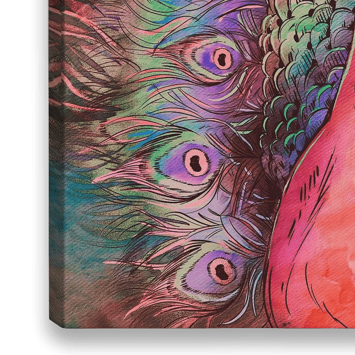 Eine expressionistische Illustration eines japanischen Pfau in starken Farben vor einem prachtvoll gemalten Hintergrund mit sanfter Textur.