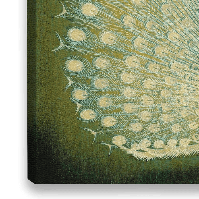 Eine Japanische Illustration eines Pfau in Naturfarben vor einem handgemalten Hintergrund.