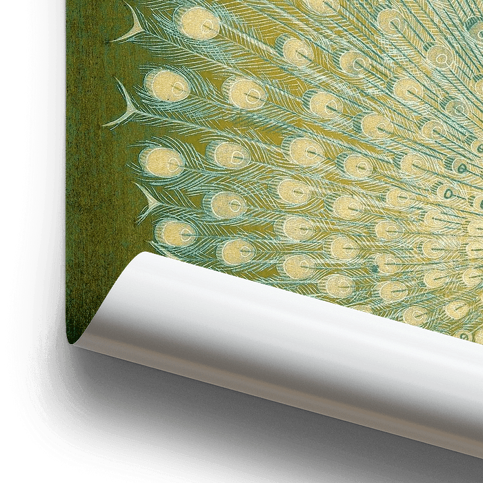 Eine Japanische Illustration eines Pfau in Naturfarben vor einem handgemalten Hintergrund.
