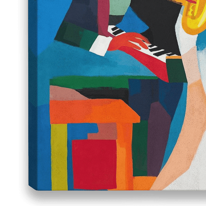 Ein farbenfrohes abstraktes Gemälde einer Jazzband, die mit Leidenschaft auftritt. Die kräftigen Farbtöne und fließenden Formen erwecken den Rhythmus und die Improvisation des Live-Jazz zum Leben
