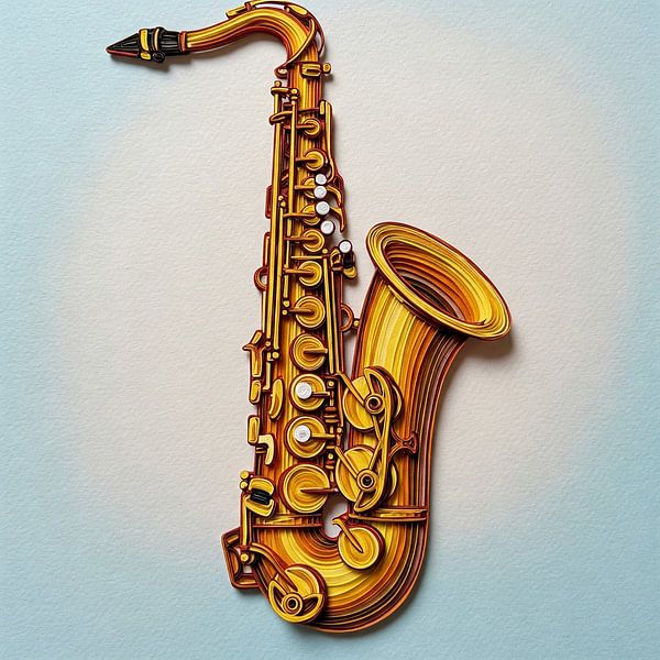 Stilvolle Scherenschnittkunst eines goldenen Saxophons. Perfekt für Jazz-Liebhaber und Räume mit Musikthemen.