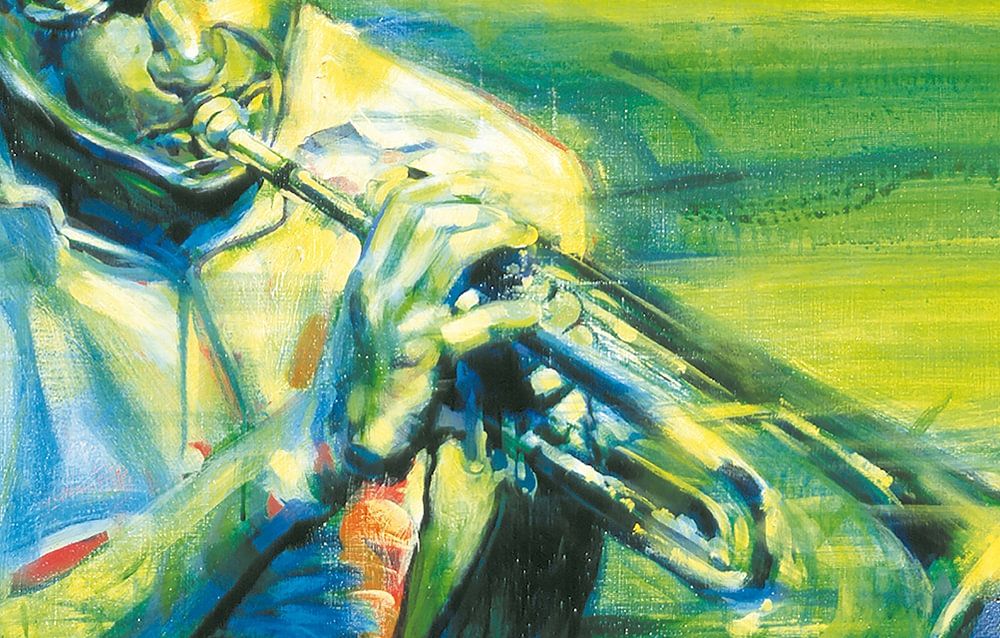Stimmungsvolles und farbenfrohes Gemälde des Trompeters Clifford Brown (1930-1956) Originalgröße: 160 x1 00 cm. Material: Acryl auf Leinwand. Clifford Benjamin Brown (30. Oktober 1930 - 26. Juni 1956) war ein amerikanischer Jazz-Trompeter, Pianist und Komponist. Er starb im Alter von 25 Jahren bei einem Autounfall.