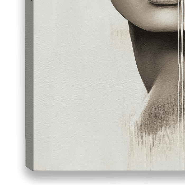 Dieses Kunstwerk zeigt eine ruhige Frau mit einem geschlossenen Auge, das durch abstrakte Pinselstriche teilweise verschwommen ist. Ihre weichen Gesichtszüge, umrahmt von einem weißen Band und einer Blume, strahlen Ruhe und Verletzlichkeit aus. Die Kombination aus Realismus und verblassenden Linien suggeriert ein empfindliches…