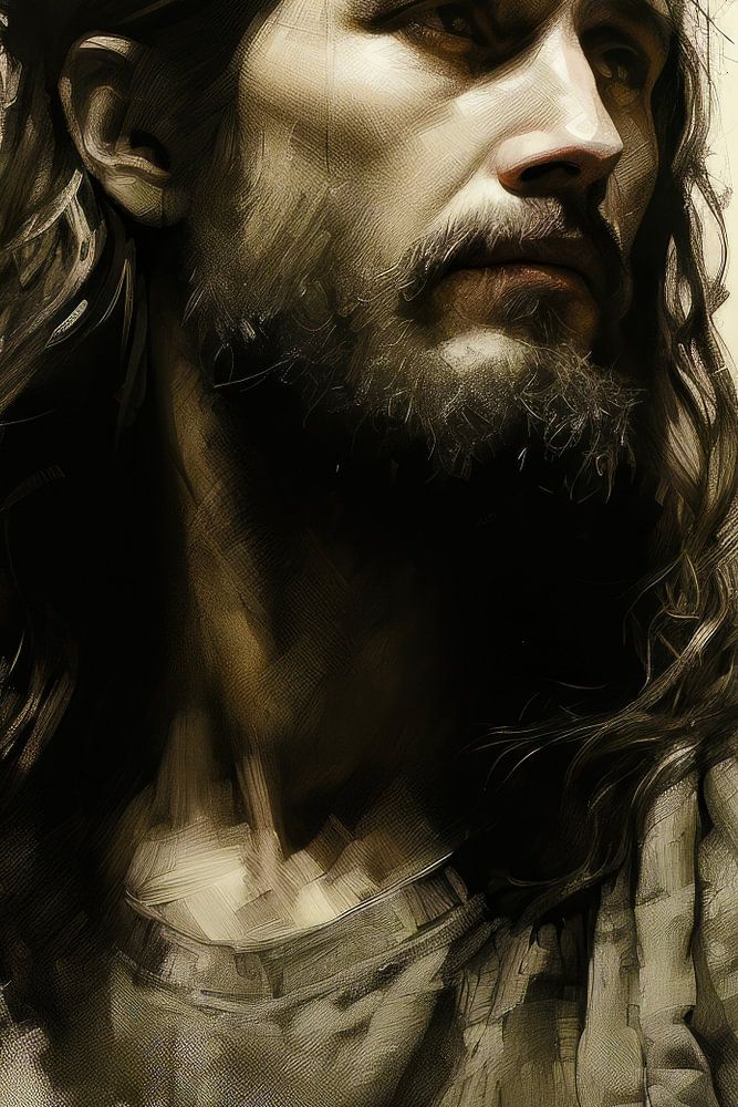 Im Zentrum des Kunstwerks trägt Jesus die bekannte Krone aus Dornenzweigen, ein Symbol für sein Leiden und sein Opfer. Die Dornen scheinen mit seinen Gedanken und Gefühlen verwoben zu sein, denn sie berühren seine Stirn und werfen einen Schatten des Unbehagens auf sein Antlitz. Seine Augen, die einst vor Mitgefühl und Verständnis leuchteten, sind nun in einer Mischung aus Traurigkeit und Nachdenklichkeit niedergeschlagen. Jede Linie und jedes Detail seines Gesichts trägt die Last der Welt auf seinen Schultern.