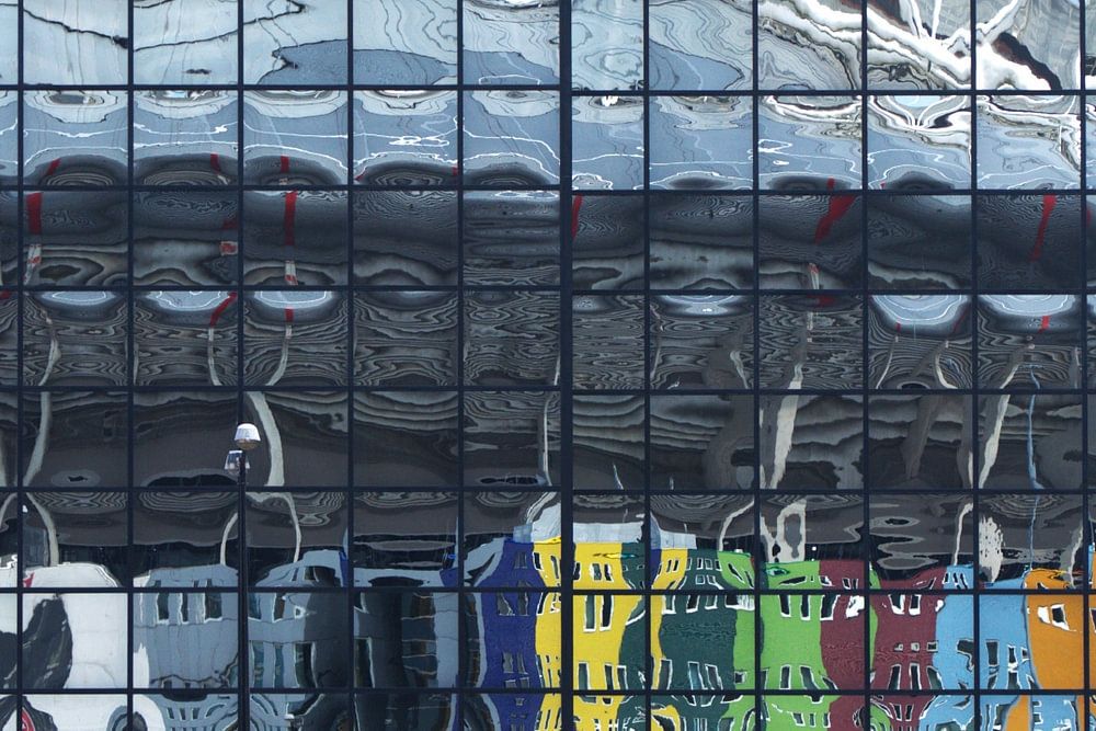 Obwohl das Gebäude durch die vielen Fenster des gegenüberliegenden Gebäudes verzerrt wird, ist das Stadion noch erkennbar.