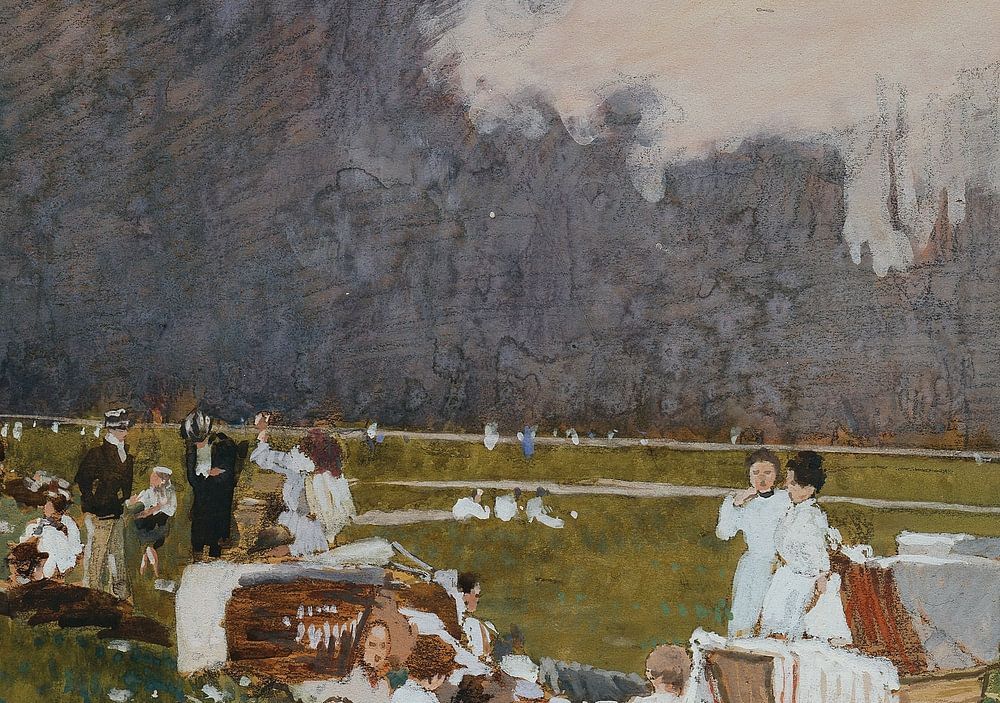 Familien, bestehend aus Männern und Frauen, Eltern und Kindern, ruhen auf einer Wiese in ihrer Sonntagskleidung wie bei einem Picknick.