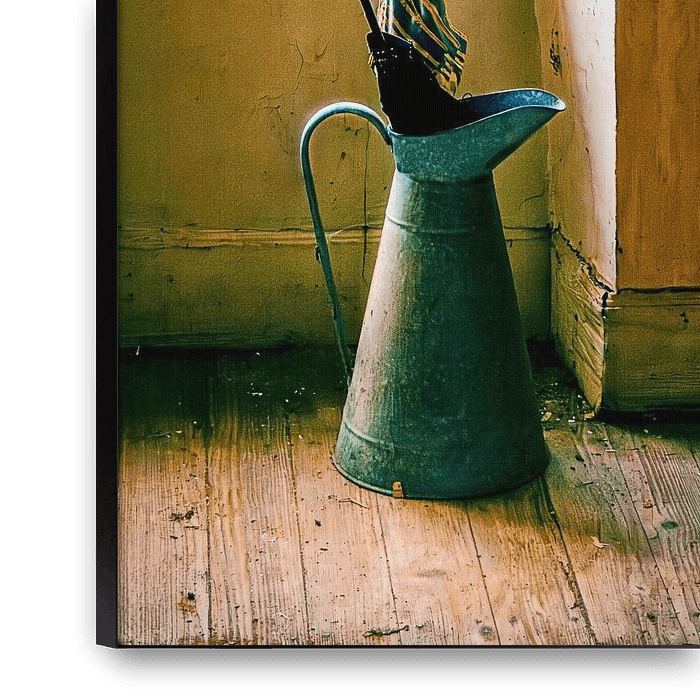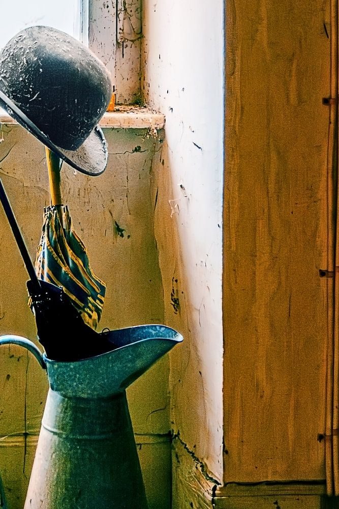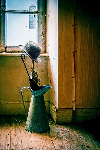 Ein alter Wasserkrug, der als Schirmständer dient. Diese schöne Ecke habe ich in einem verlassenen Bauernhaus in Luxemburg gefunden. Der Bowler-Hut erinnerte mich sofort an den Hut von John Steed aus der englischen Fernsehserie The Avengers.