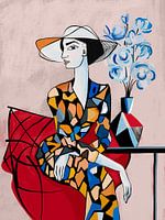 Ein stilvolles, modernes Porträt von Josephine, die anmutig auf einem leuchtend roten Sofa sitzt, gekleidet in ein Outfit mit geometrischen Mustern und einem eleganten Hut. Neben ihr sorgt eine Vase mit zartblauen Blumen für Ausgewogenheit und Ruhe in der kühnen Komposition, die kubistisch inspirierte Formen mit zeitgenössischem…