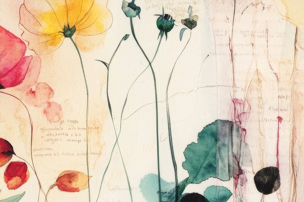 "Journal" botanisches Aquarell. Es scheint nur ein Blatt mit losen Kritzeleien zu sein, locker und spielerisch zusammengemischt, mit Blumen in der Hauptrolle. Ein besonderer Blickfang für Ihr Interieur!