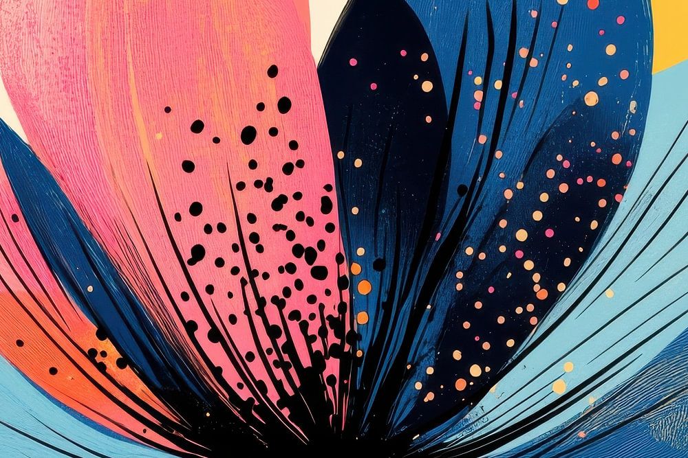 Die übergroßen Blütenblätter in kräftigen Rosa-, Marine- und Himmelblautönen strahlen von einem dunklen Zentrum aus, das mit dynamischen Tuschelinien und verspielten Farbspritzern akzentuiert ist. Schwebende Punkte und organische Formen in Gelb, Koralle und Türkis bilden einen lebendigen Hintergrund, der die ausdrucksstarke Form der Blume unterstreicht.
