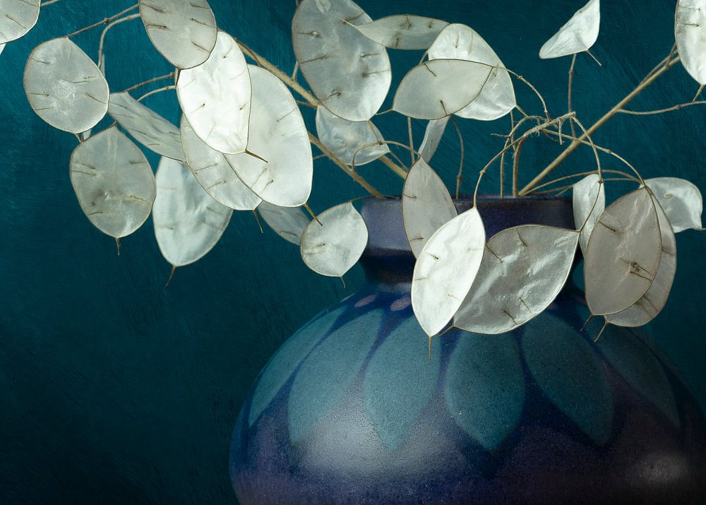 Die Judas-Medaille wird seit Jahrzehnten als Dekoration im Haushalt verwendet. Das ist nicht so merkwürdig. Wenn das Licht auf die Medaillen fällt, werden sie zu wahren Kunstwerken der Natur. Auch in diesem Werk wurde Licht verwendet, durch die Anwendung von Rembrandt-Licht erinnert es an ein Werk von Malern aus dem 17. Jahrhundert, dem Goldenen Zeitalter. Die petrolblaue Farbe des Hintergrunds und der Vase steht in schönem Kontrast zu den Medaillen und passt zu vielen modernen Einrichtungsstilen. Kurzum, ein wahrer Blickfang in Ihrem Zuhause!
