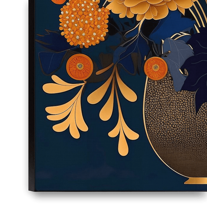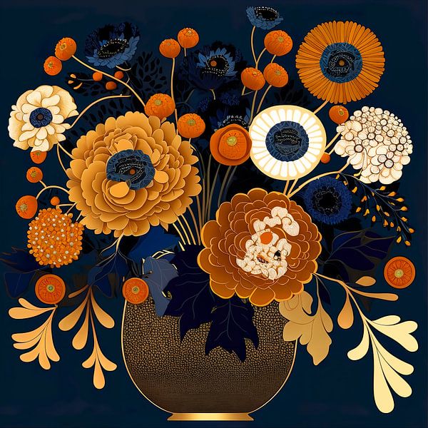 Dieses Blumenbild im Jugendstil ist ein raffiniertes Kunstwerk mit stilisierten Blumenmotiven und organischen Linien. Das Gemälde ist in dunkelblauen, orangefarbenen, goldenen und weißen Tönen gehalten, die einen frischen, eleganten und harmonischen Look erzeugen. Der dunkelblaue Hintergrund des Gemäldes bildet einen schönen Kontrast zu…