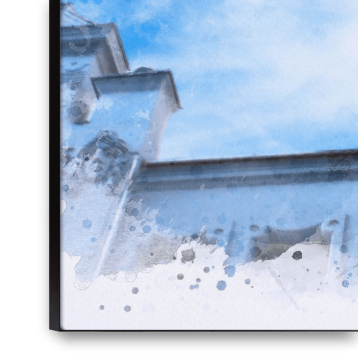 Bestelle dieses abstrakte Wandbild Jugendstilhaus in Blau in Prag, Aquarell von Annavee als Reproduktion auf Leinwand, Alu-Dibond, als Poster, Fototapete oder Acrylglasbild.