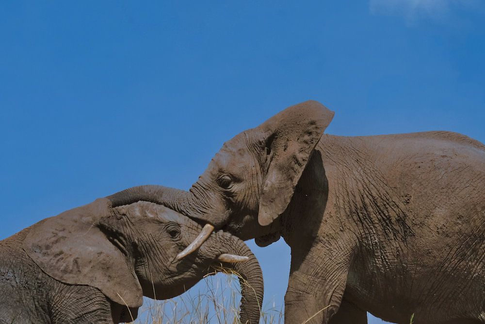 2 junge Elefanten spielen auf einer Graslandschaft vor blauem Himmel