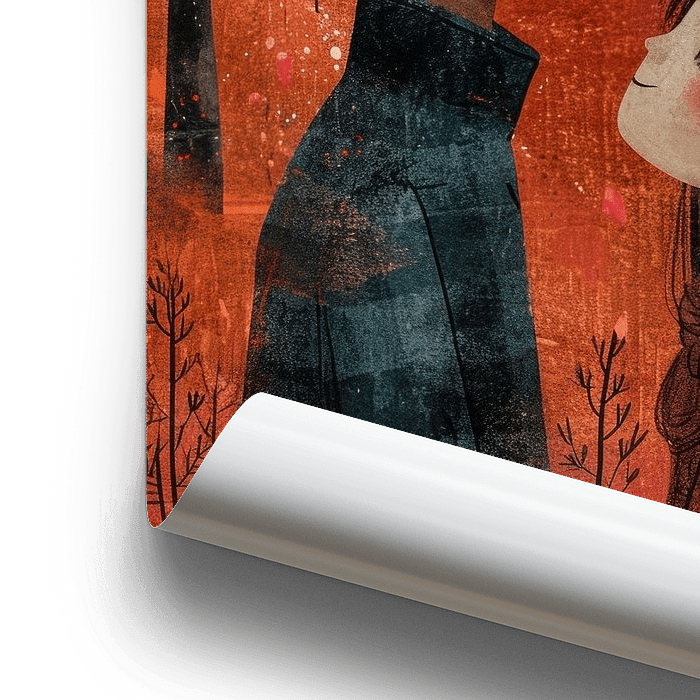 Dieses stimmungsvolle illustrative Kunstwerk zeigt einen zärtlichen Moment zwischen einem Jungen und einem Mädchen, umgeben von einer bezaubernden Herbstlandschaft. Warme Rot- und Orangetöne bilden eine romantische Kulisse, während fallende Blätter und stimmungsvolle Häuser die Geschichte von junger Liebe und Unschuld unterstreichen. Die weichen Pinselstriche und die niedlichen Details verleihen diesem Werk eine verträumte, verspielte Atmosphäre, perfekt für Liebhaber von Illustrationen und herbstlichen Dekorationen.