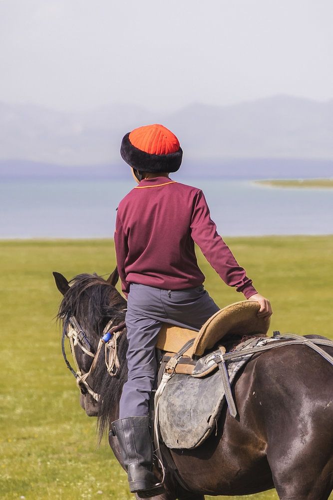 Ein junger Reiter, kaum zehn Jahre alt, eingefangen in einem Moment der Stille und Kraft. Seine Gestalt hebt sich von den endlosen Graslandschaften Kirgisistans ab, wo der Horizont mit dem bezaubernden Soň-Köl-See und den Bergen in der Ferne verschmilzt. Halb in den Steigbügeln stehend, mit dem Rücken zu uns, scheint er in die weite Welt hinauszureiten. Die Farben strahlen die reine, unverfälschte Schönheit der Steppe aus.
