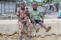 Zwei Jungen in Cotonou, Benin, an einer Wand, die mich sitzen. In dieser Umgebung nicht sehen, viele Touristen an.