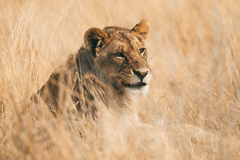 Bestelle dieses Löwen-Wandbild Junger Löwe in der Savanne von Stef Heijenk als Reproduktion auf Leinwand, Alu-Dibond, als Poster, Fototapete oder Acrylglasbild.