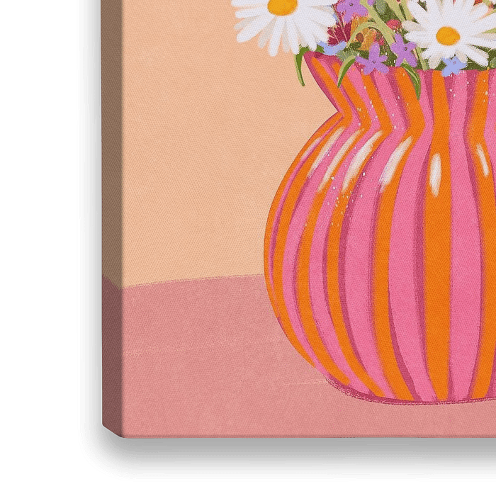 Farbenfrohe Illustration eines Blumenstrauß in einer orange pink getreiften Vase.