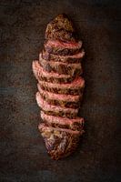 Der Feldhase ist eine wunderbare Sache zum Fotografieren! Es ist das Steak aus dem Vorderviertel der Kuh, der Schulter. Bei Tageslicht fotografiert, erhält er in Kombination mit der rostigen Hintergrundfarbe einen schönen Glanz.