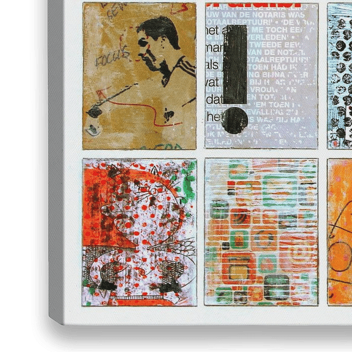 Mischtechnik und Montage auf Papier. Diese Arbeit gehört zur Reihe Collagen. Die Collagen sind mit allerlei Fotos, Bildern und Bildern aufgebaut, die ich im Laufe der Jahre gesammelt habe. Zuerst male ich eine Oberfläche mit Aquarell- oder Acrylfarbe und bearbeite sie mit Stempeldruck, Farbspritzern und Doodle-Zeichnungen. Die Collage…