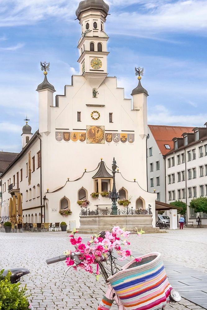Die Stadt Kempten liegt idyllisch im Allgäu. Das ursprüngliche Kemptener Rathaus im Fachwerkbau war aus dem Jahre 1368 und diente als Kornspeicher und Ratssaal. Es wurde 1474 als Steinbau erneuert. Noch heute haben die Bürgermeister ihren Sitz in diesem historischen Gebäude am Rathausplatz Kempten. Klassische Ansicht mit einem geschmückten Fahrrad.