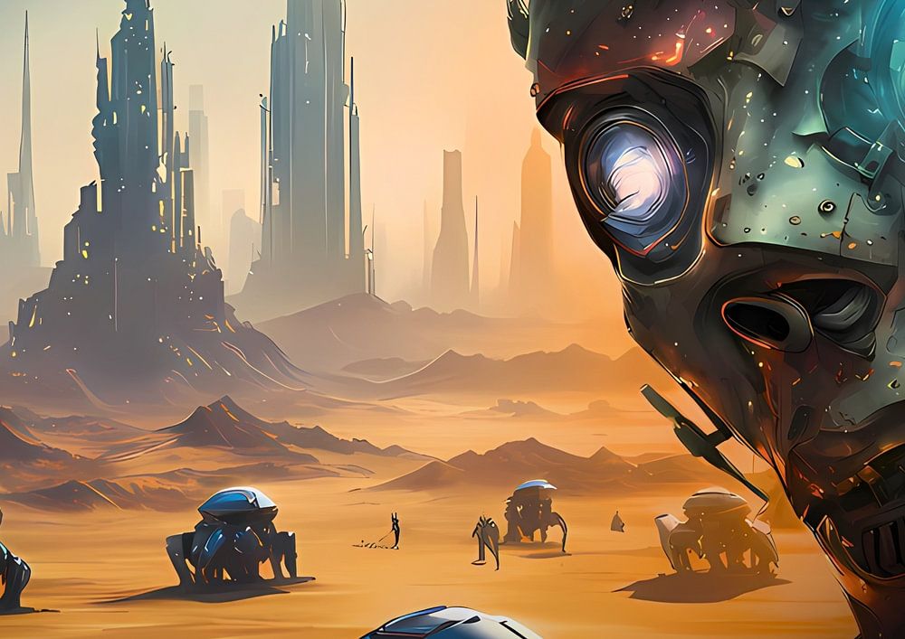 Ein digitales Gemälde stellt eine dystopische Zukunft dar, in der die künstliche Intelligenz die Macht übernommen hat. Das Bild zeigt eine Nahaufnahme eines Robotergesichts mit leuchtend blauen Augen vor dem Hintergrund einer trostlosen Wüstenlandschaft. In der Ferne ragen futuristische Gebäude aus dem Sand, die auf eine einst blühende Zivilisation hindeuten. ANMERKUNGEN: Wetter-, Wind- und UV-Indikatoren beziehen sich auf Wetteraufzeichnungen auf dem Planeten Mars.