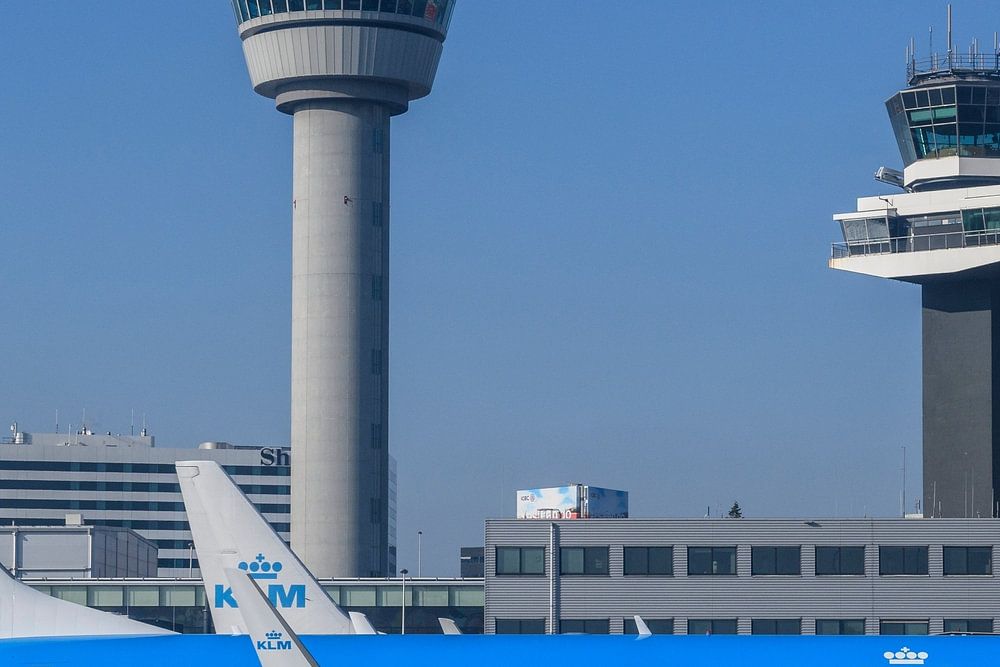 KLM-Flugzeuge auf dem Flughafen Amsterdam Schiphol in Holland. Die Flugzeuge sind an den Gates geparkt oder rollen zu den Start- und Landebahnen rund um das Terminalgebäude.