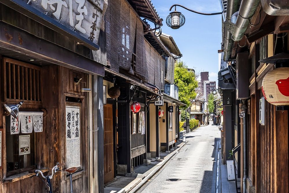 Impression der schmalen, atmosphärischen Pontocho-Gasse in Kyoto. Ein legendäres Viertel, das für seine traditionellen Teehäuser, Laternenlicht und authentische Gastronomieszene bekannt ist. Die enge Straße ist flankiert von Machiya-Häusern mit hölzernen Fassaden, Bambusjalousien und noren-Vorhängen, die ein Gefühl von Intimität und Geschichte vermitteln. Links im Bild zieht ein kleines Restaurant mit handgeschriebenen Speisekarten, einem abgestellten Fahrrad und einer großen Holztafel die Aufmerksamkeit auf sich. Rechts hängen dekorative Papierlaternen, die einen Hauch Abendstimmung erahnen lassen. Die klare Linienführung der Gasse leitet den Blick in die Tief; hinein in ein Kyoto, das seine Vergangenheit lebendig hält und gleichzeitig modern offenbart.