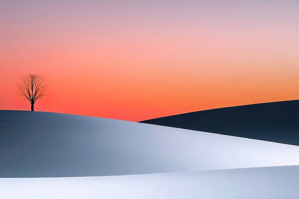 Hier kontrastiert ein einzelner kahler Baum auf einem weißgrauem, Kälte ausstrahlendem Hügel mit einem Himmel, der in tiefem Blau und leuchtendem Rot erstrahlt. Die Farbpalette erzeugt eine spannungsreiche Stimmung zwischen Kälte und der glühenden Wärme des Sonnenuntergangs. Die Komposition wirkt wie ein stilles Gedicht über Isolation, Schönheit und die Kraft der Natur, die selbst in der Stille eine starke Präsenz entfaltet.