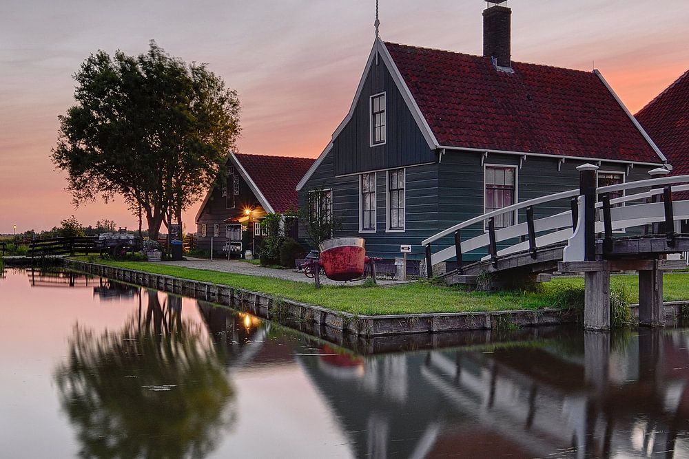 Käserei Zaanse Schans bei Sonnenaufgang mit einem schönen Spiegelbild