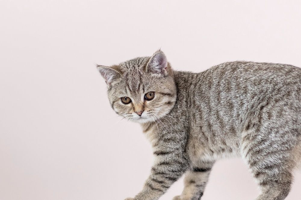 Porträt Kätzchen Bobbie auf weißem Grund gegen rosa Hintergrund