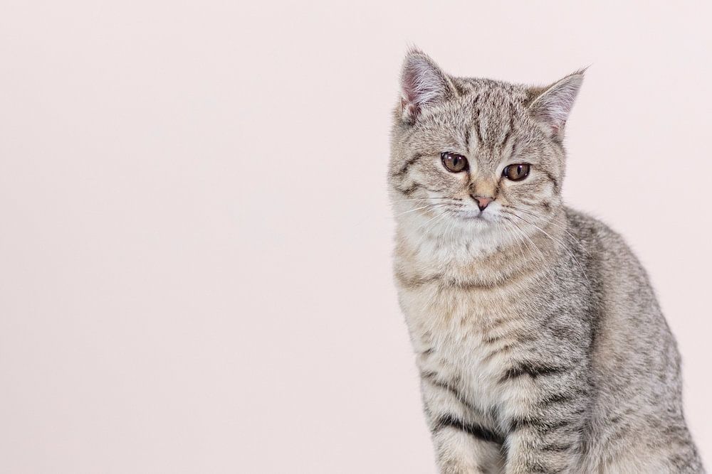 Porträt Kätzchen Bobbie auf weißem Grund gegen rosa Hintergrund