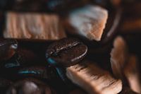 Nahaufnahme einer frisch gerösteten Kaffeebohne mit Holzspänen. Nichts schmeckt besser als frisch gebrühter Kaffee. Idealer Teller für den Kaffeeliebhaber!