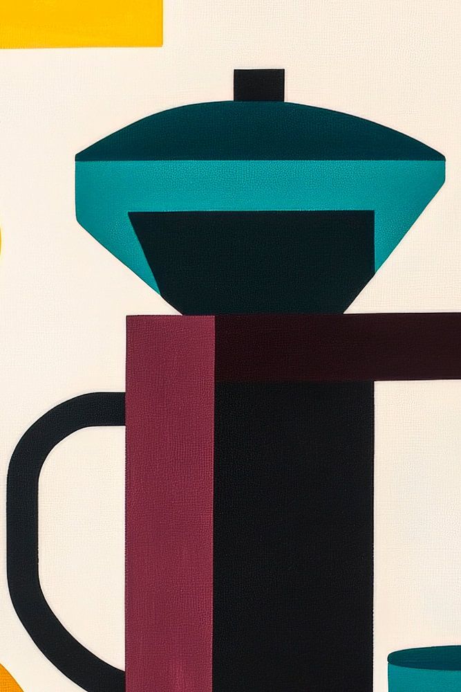 Eine harmonische Komposition aus geometrischen Formen und kräftigen Farben, die das Gefühl von Kreativität und modernem Lebensstil vermittelt. Die stilisierte Kaffeekanne und die lebendigen Akzente schaffen eine einladende Atmosphäre, ideal für die Küche oder einen Café-Bereich, wo Genuss und gesellige Zusammenkünfte im Vordergrund stehen.