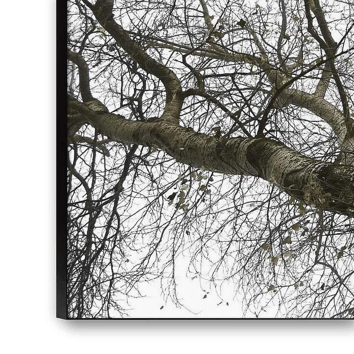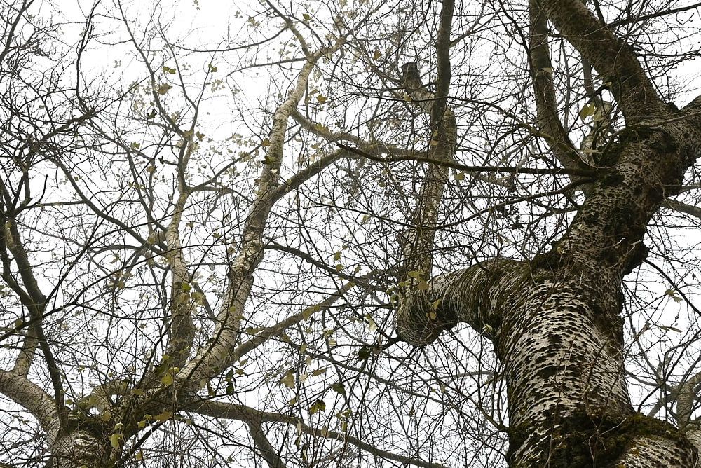Schauen Sie nach oben, ein wunderschönes, kahles Blätterdach der Bäume.