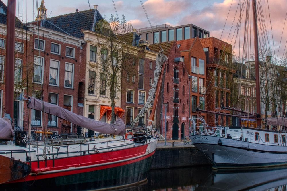 Schiffe liegen am Kai der A, auf der Seite der Hoge der A. Zu sehen ist die A-Brücke, die die Hoge der A und die Lage der A verbindet. Die historischen Grachtenhäuser und Segelschiffe vermitteln einen Eindruck von der Geschichte der Stadt Groningen.