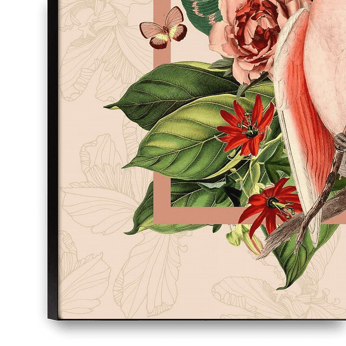 Aus der Kollektion „ 'Tegels' ” mit botanischen Elementen, einer Collage aus Kamelien, Blättern, Schmetterlingen und Kakadus und einem rosa Rahmen. Mit handgezeichneten Elementen.