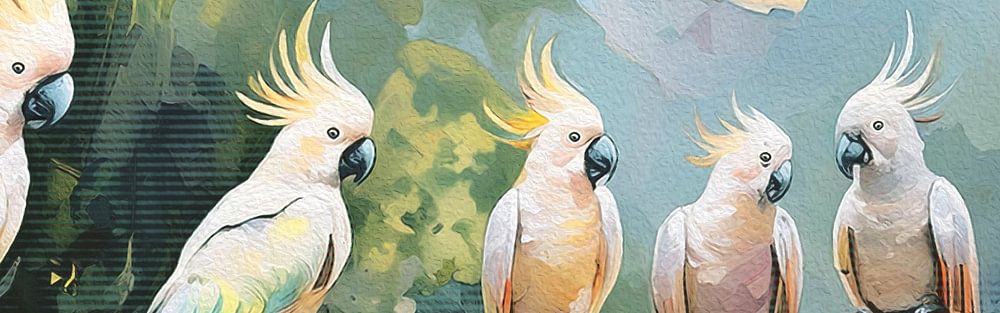 Sieben Kakadus sitzen gemeinsam auf einem Ast im Dschungel. Ein tropisches Kunstwerk mit vielen Schattierungen von Grün und Blau. Holen Sie sich mit diesem farbenfrohen Druck ein Stück Natur und Dschungel in Ihr Zuhause.
