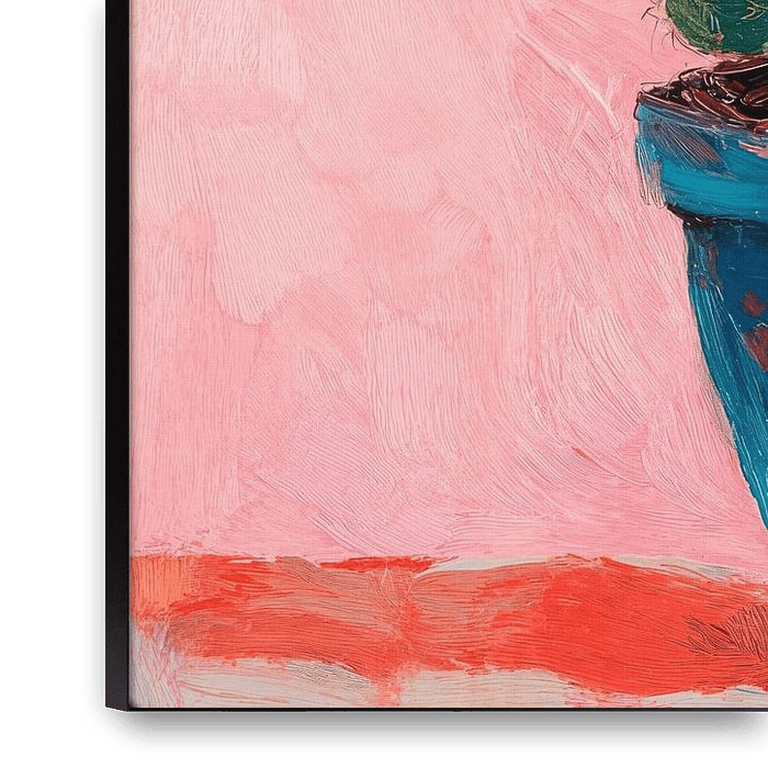In einem leuchtend blauen Topf entfaltet sich eine lebendige Ansammlung von Kakteen, deren fleischige, grüne Blätter in verschiedenen Formen sprießen. Der sanfte Kontrast zur rosafarbenen Wand hinterlässt einen frischen, fröhlichen Eindruck und lässt die Natur in einem harmonischen Spiel von Farben erblühen. Ein kleiner Ausbruch des…