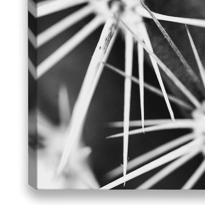 Nahaufnahme der Stacheln eines Kaktus in schwarz-weiß