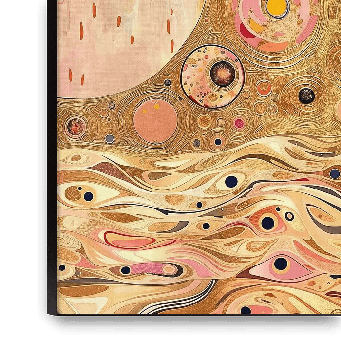 "Kaleidoscopic Dreams" ist ein raffiniertes Stück, bei dem sanfte Pastellfarben und reiche goldene Kreise zu einem hypnotischen Muster verschmelzen. Die lange, schlanke Form ist ideal, um einem Raum ein Gefühl von Eleganz und Länge zu verleihen, zum Beispiel in einem Arbeitszimmer oder hinter einem Esstisch. Es bietet eine moderne…