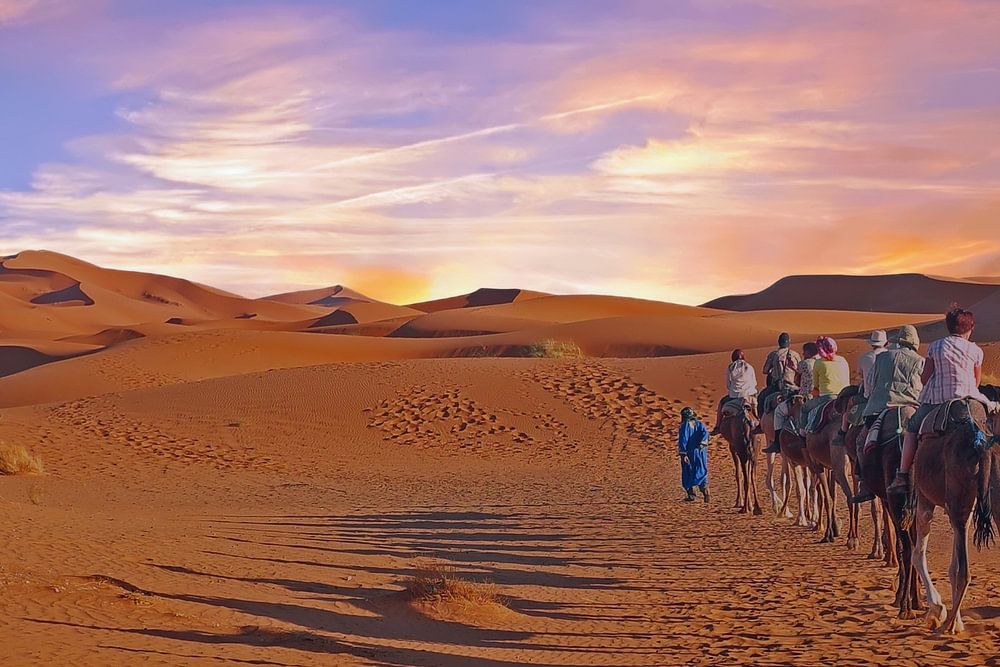 Kamelkarawane durch die Wüste Sahara bei Sonnenuntergang in Marokko