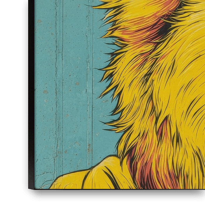 Dieses leuchtende Pop-Art-Werk zeigt eine Nahaufnahme eines Kaninchens, bei dem leuchtendes Gelb und warmes Weiß das Fell dominieren, ergänzt durch Akzente in Rot und Schwarz. Der Hintergrund in Blau und Orange schafft einen starken Kontrast, der das Kaninchen noch mehr hervorhebt. Die klaren Linien und dynamischen Farbblöcke verleihen…