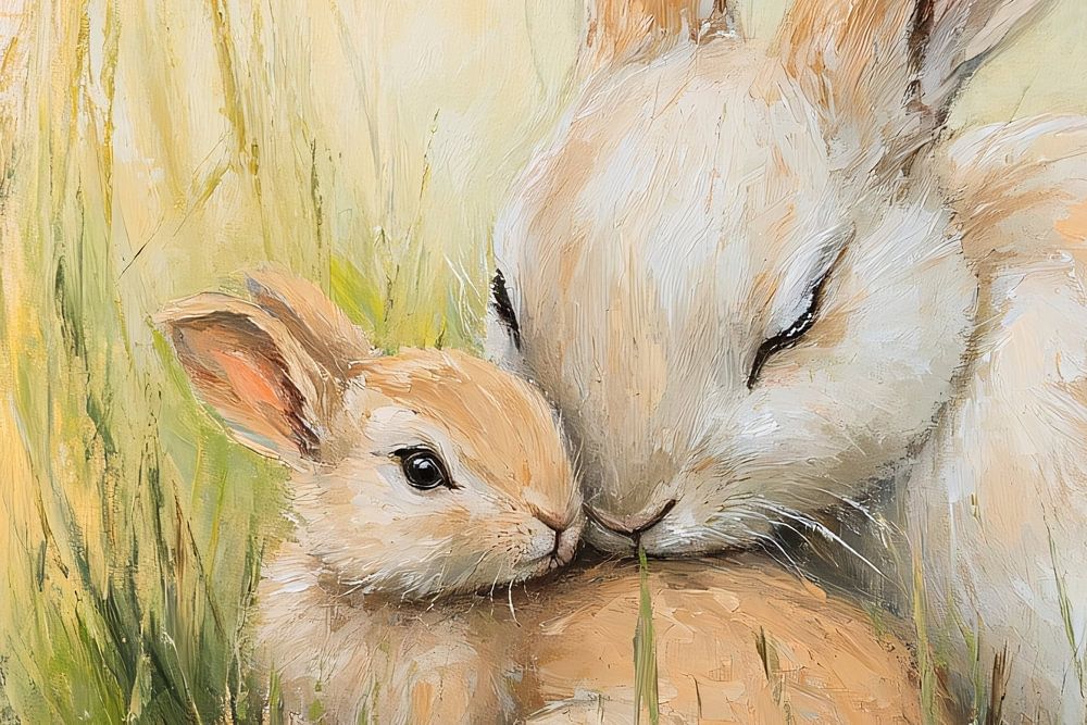 Dieses schöne Gemälde zeigt eine Kaninchenmutter mit ihrem Kleinen, die sich gemeinsam im Gras entspannen. Die sanften Farben und der impressionistische Stil vermitteln ein warmes und liebevolles Gefühl, ideal für Natur- und Tierliebhaber. Dieses Gemälde strahlt Ruhe und Geborgenheit aus und eignet sich perfekt, um eine intime Atmosphäre in Ihrem Wohn-, Schlaf- oder Esszimmer zu schaffen. Das zarte Design eignet sich für eine Vielzahl von Einrichtungsstilen und ist ein subtiler, aber fesselnder Blickfang in jedem Raum. Bringen Sie mit diesem einzigartigen Kunstdruck einen Hauch von natürlicher Schönheit und Sanftheit in Ihr Interieur.