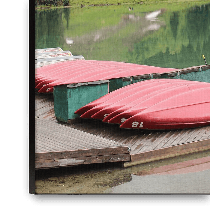 Kanus an der Uferpromenade des Emerald Lake in Britisch-Kolumbien, Kanada. Im Hintergrund sieht man Pinienbäume und die Berge der Rocky Mountains.